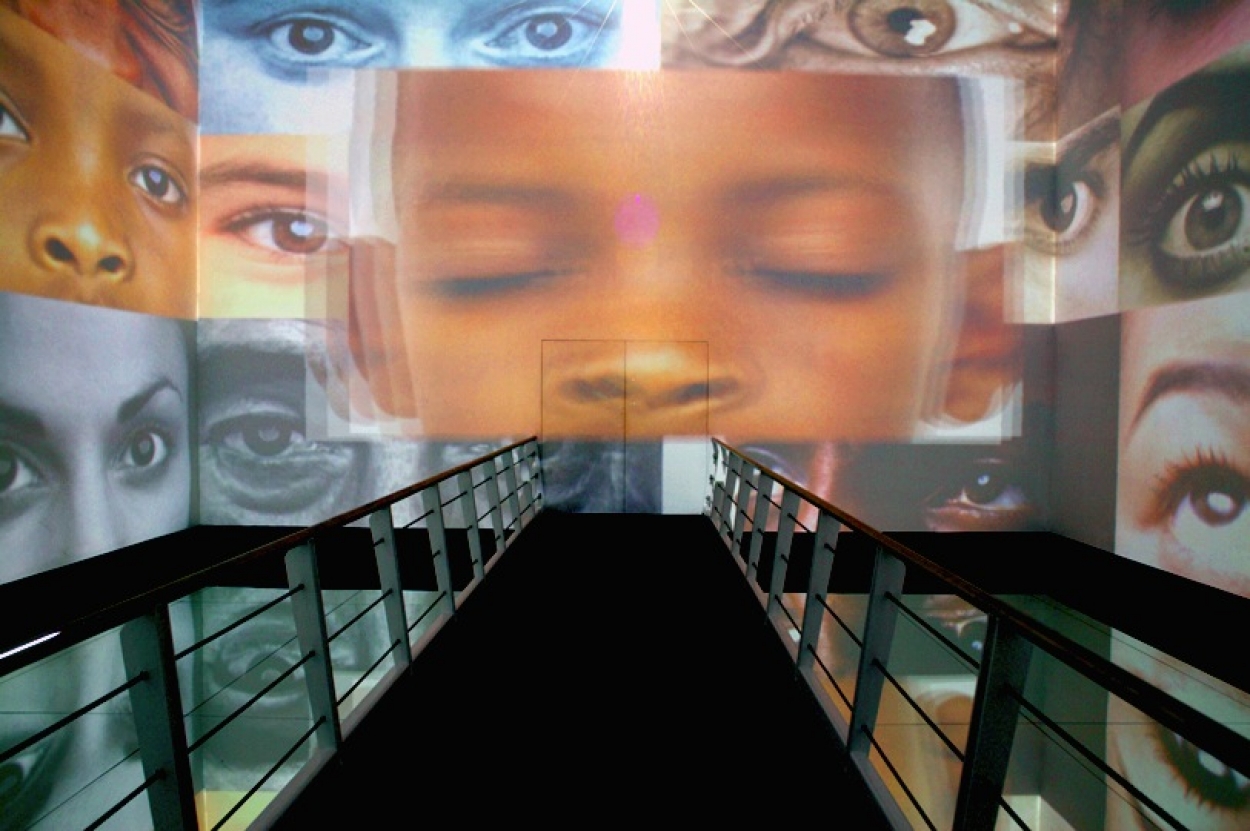 "FUTURO DA TERRA" Pavilion: two multimedia immersive shows inside a geometric cube staged as a time machine. Non-stop projection on the four inside surfaces of the cube. Lighting, staging, fx. Projection surface 400 square meters.