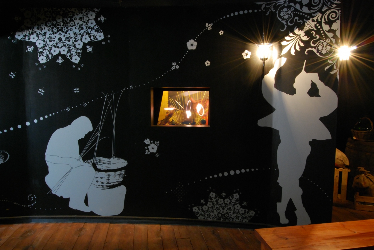 "EL ORIGEN DE MADEIRA" pavilion: integrated holography on stage (Pepper´s ghost technology). Lighting, sound, fx Three holography installations (about crafts, landscape and gastronomy) with two video channels, stage, lighting and sound.