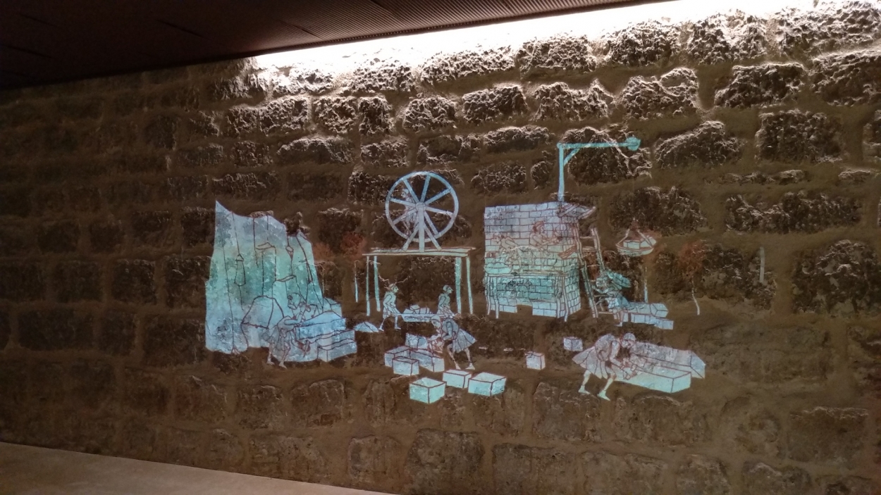 AV Sistemas constructivos: Audiovisual realizado con animación de ilustraciones. Proyección sobre muro de piedra.