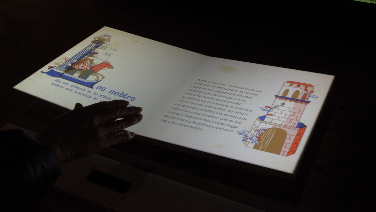 AV Península Ibérica: Mapa de situación de castillos con evolución de las fronteras a lo largo de los siglos. Proyección cenital sobre mesa 3 x 3 m. AV Libro interactivo: Audiovisual pase páginas con sesor de movimiento.