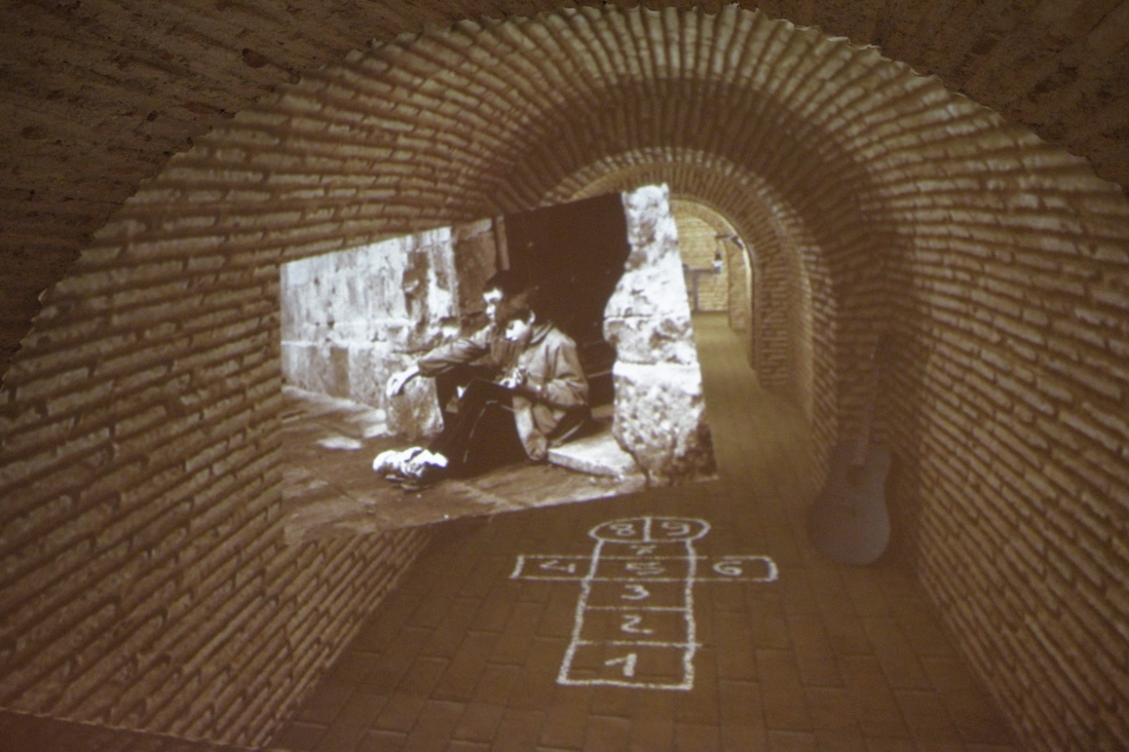 Aprovechando una arcada de ladrillo del edificio se ha conseguido profundidad de campo con una proyección de mapping 3D generado infográficamente y donde aparecen flotando diferentes elementos relacionados con la vida escolar de los niños cantores de la Catedral (Seises).